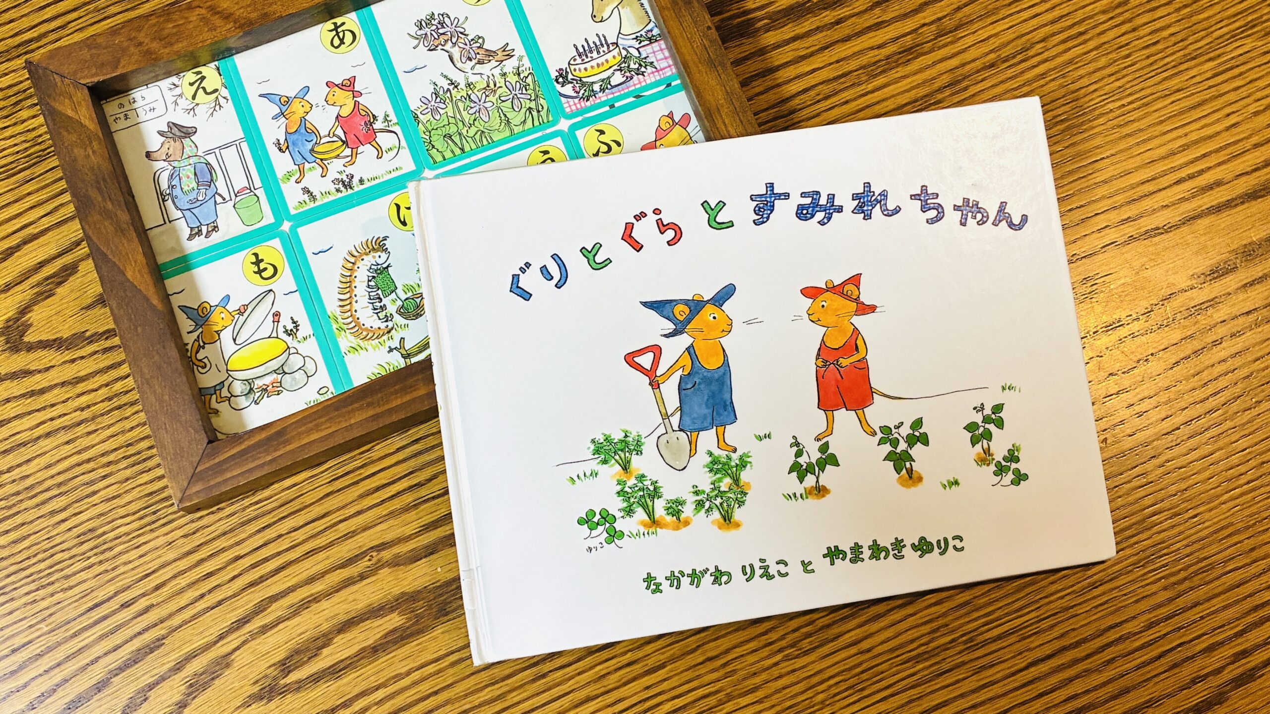 絵本と一緒に写っているのは、家族でよく遊んだ「ぐりとぐらかるた」‼