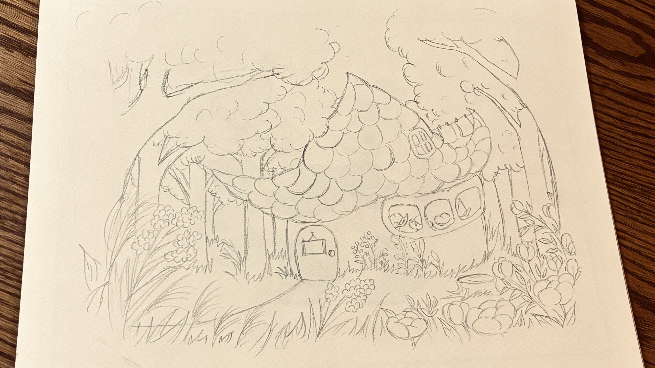 マッシュのおうち 2026 1/07 orijinal story 2026-01-07 さて、誰のお家でしょう?屋根の形がヒントです😊窓からも何か見えています、ね。^^完成が楽しみ♪ orijinal story